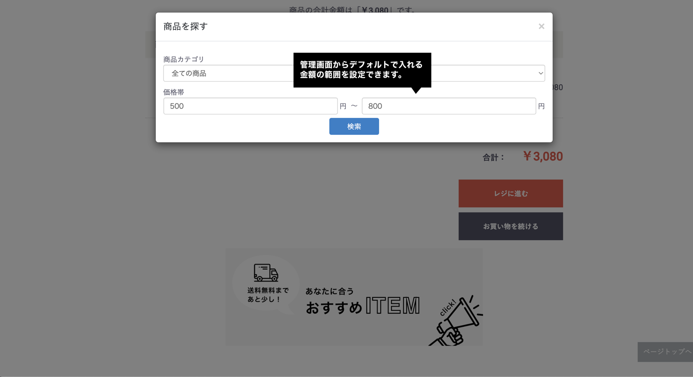 買い物中のお客さんに対して、送料無料までの金額をチェックし、 その金額で購入できる商品の検索を可能にします。